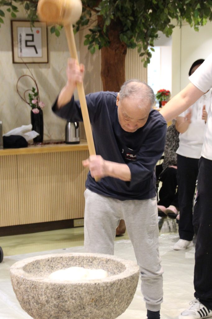 犬鳴山荘でも、玄関には門松やしめ縄が飾られ、特養ではご利用者と一緒にお餅つきしました。